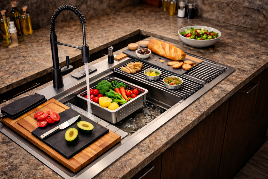 En 2026, la cocina ya no es una habitación aislada; es el escenario de nuestra vida social. Según las últimas tendencias de diseño, buscamos tecnología discreta y materiales nobles que faciliten el día a día. Si estás en plena reforma, seguro que te has preguntado: «¿Cómo puedo ganar espacio de encimera sin perder funcionalidad?». La respuesta técnica se llama Fregadero de Estación de Trabajo (o Workstation Sink).